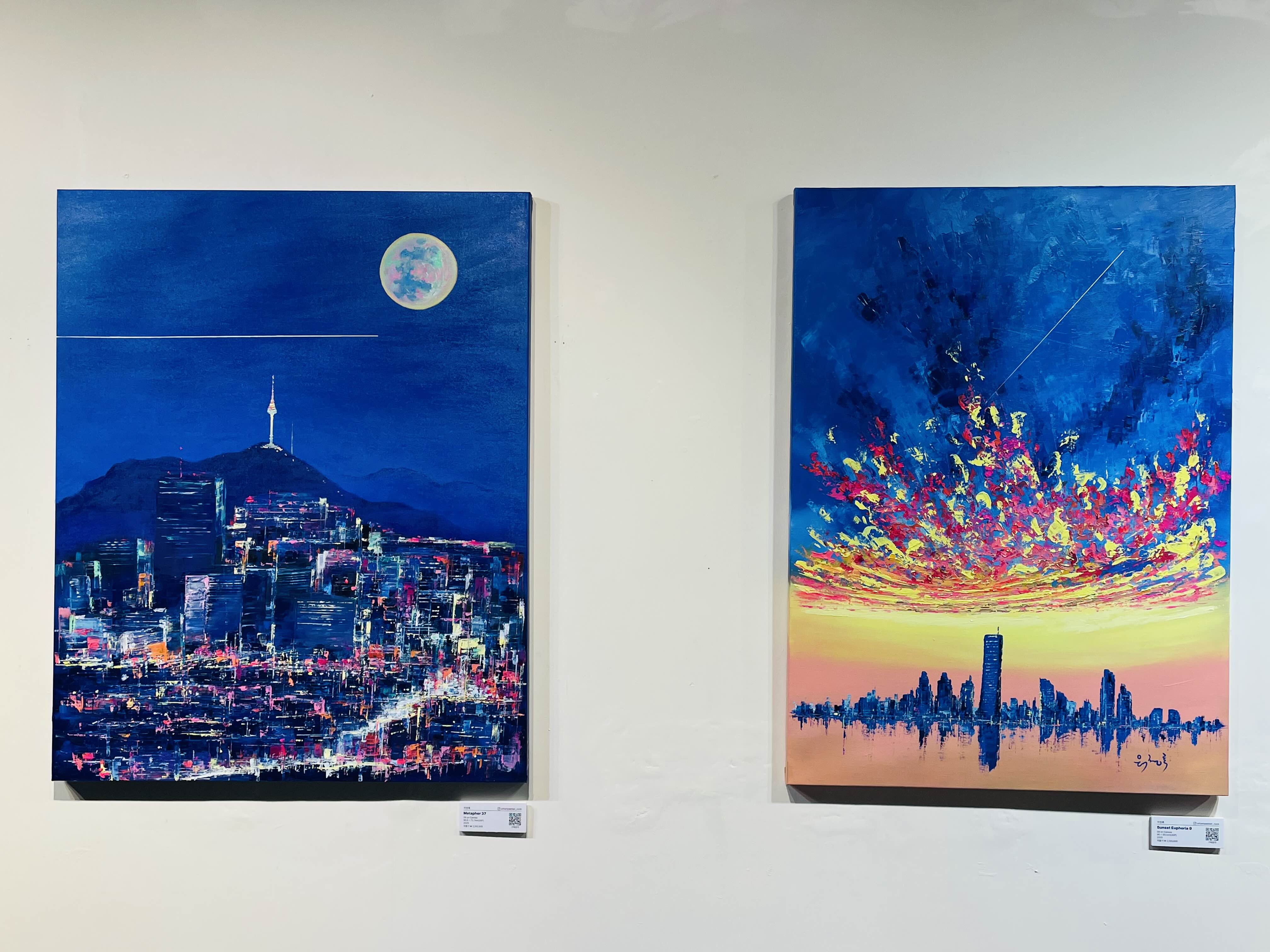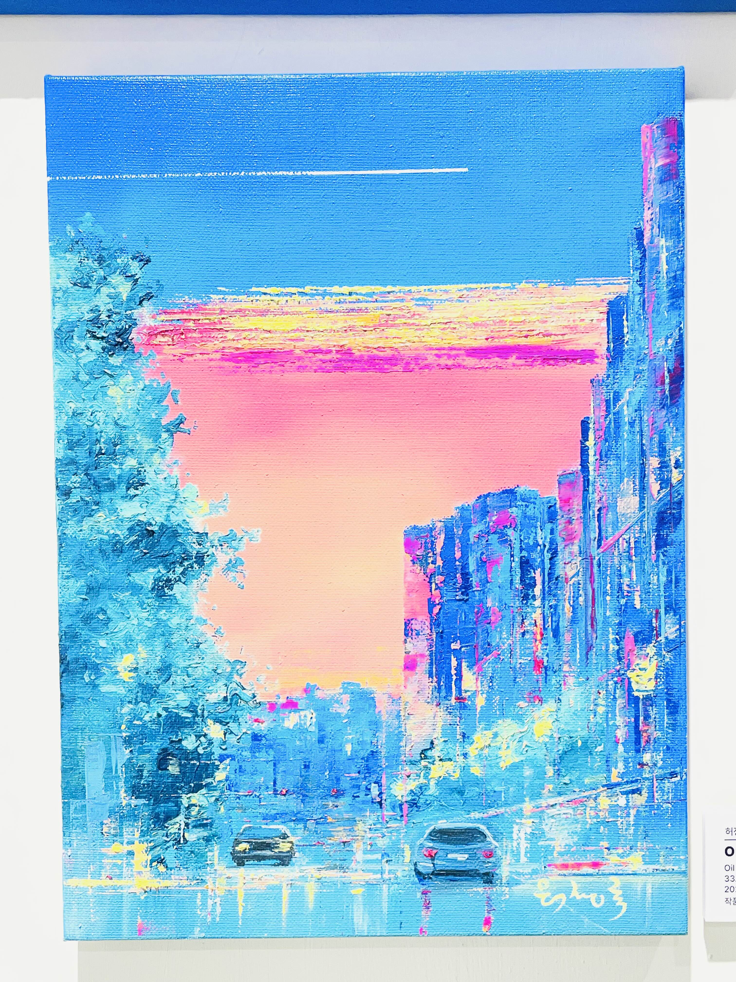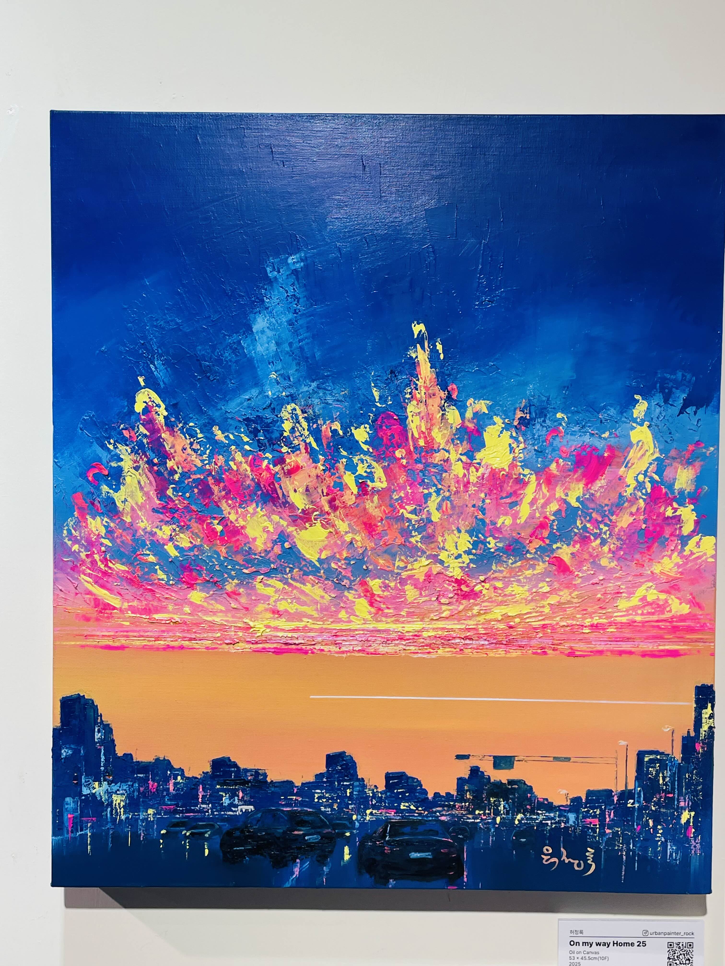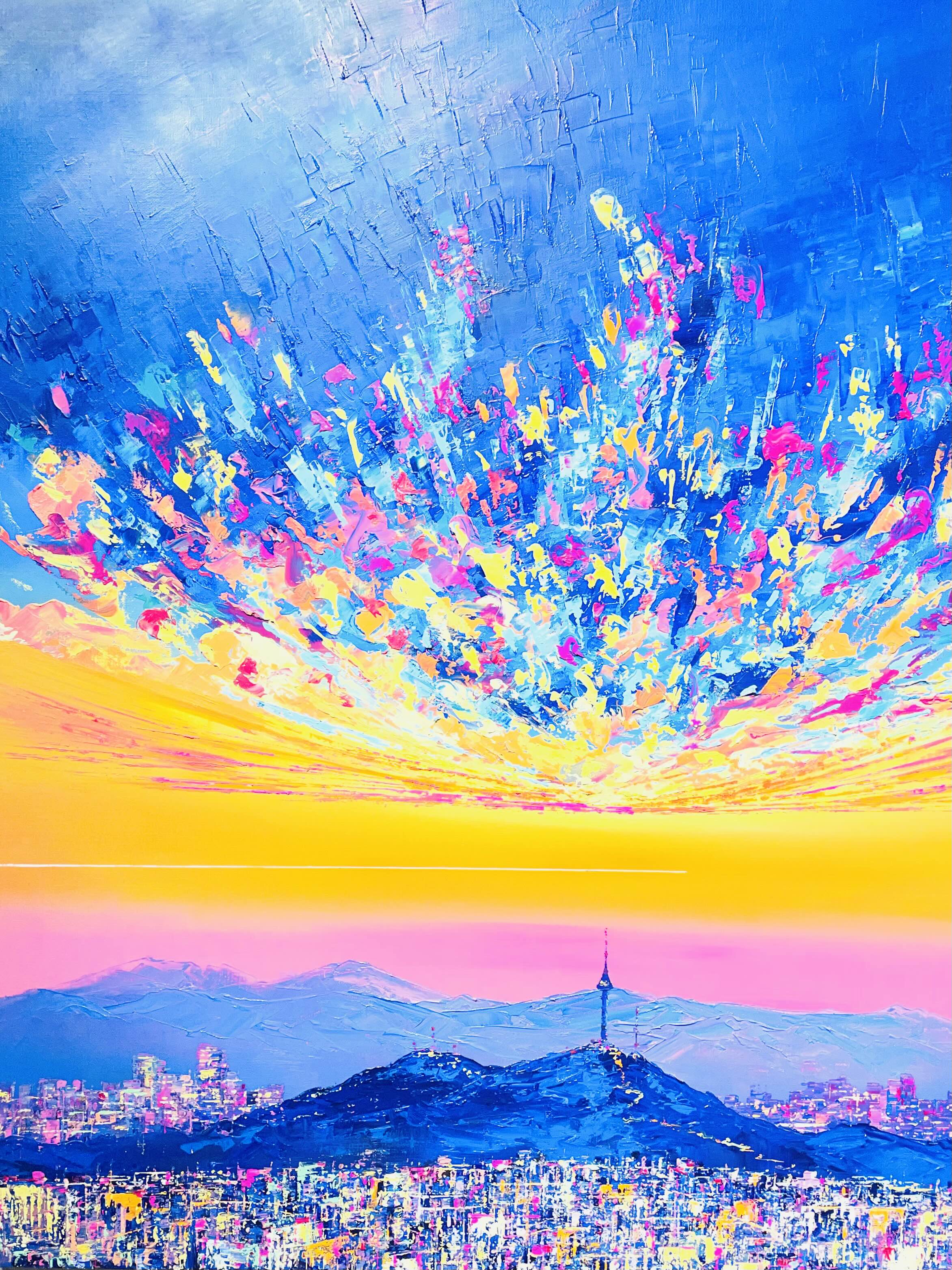 이번 전시 《Good evening, My love》는 작가가 지속적으로 탐구해온 저녁의 서사를 네 개의 연작-Sunset Euphoria〉, 〈Metaphor), 〈On my way Home〉, 〈Fantasy〉을 통해 펼쳐 보인다. 작가는 도시의 스카이라인 위로 번지는 노을, 빌딩 숲 사이로 모습을 드러내는 남산타워, 그리고 집으로 향하는 길목의 풍경을 강렬한 색채와 역동적인 붓질로 포착한다. 화면 위에서 분홍과 주황, 푸른 밤의 색조가 충돌하고 화해하는 방식은 낮과 밤, 노동과 휴식, 역할과 본연의 자아 사이를 오가는 현대인의 심리적 진동을 시각화한다.