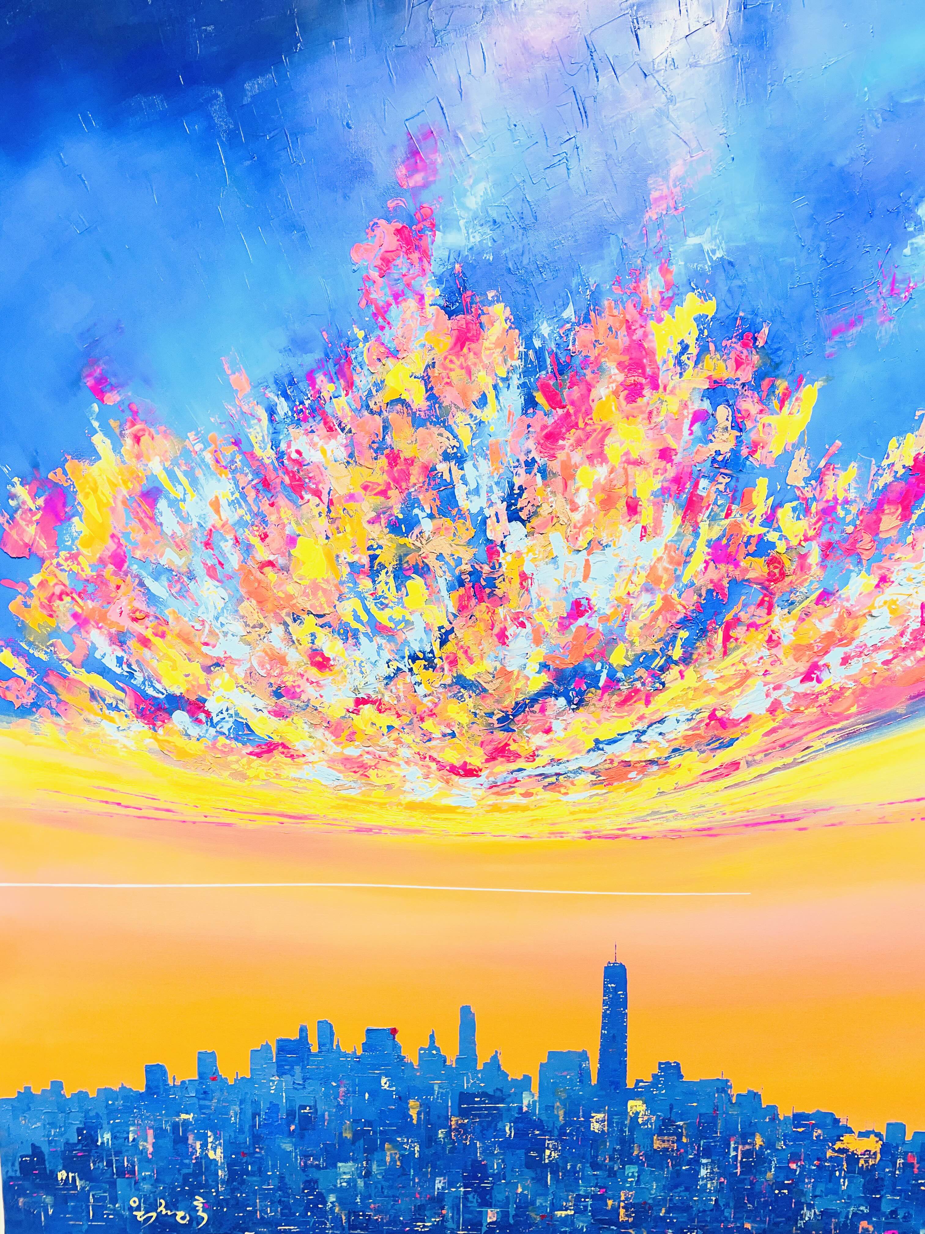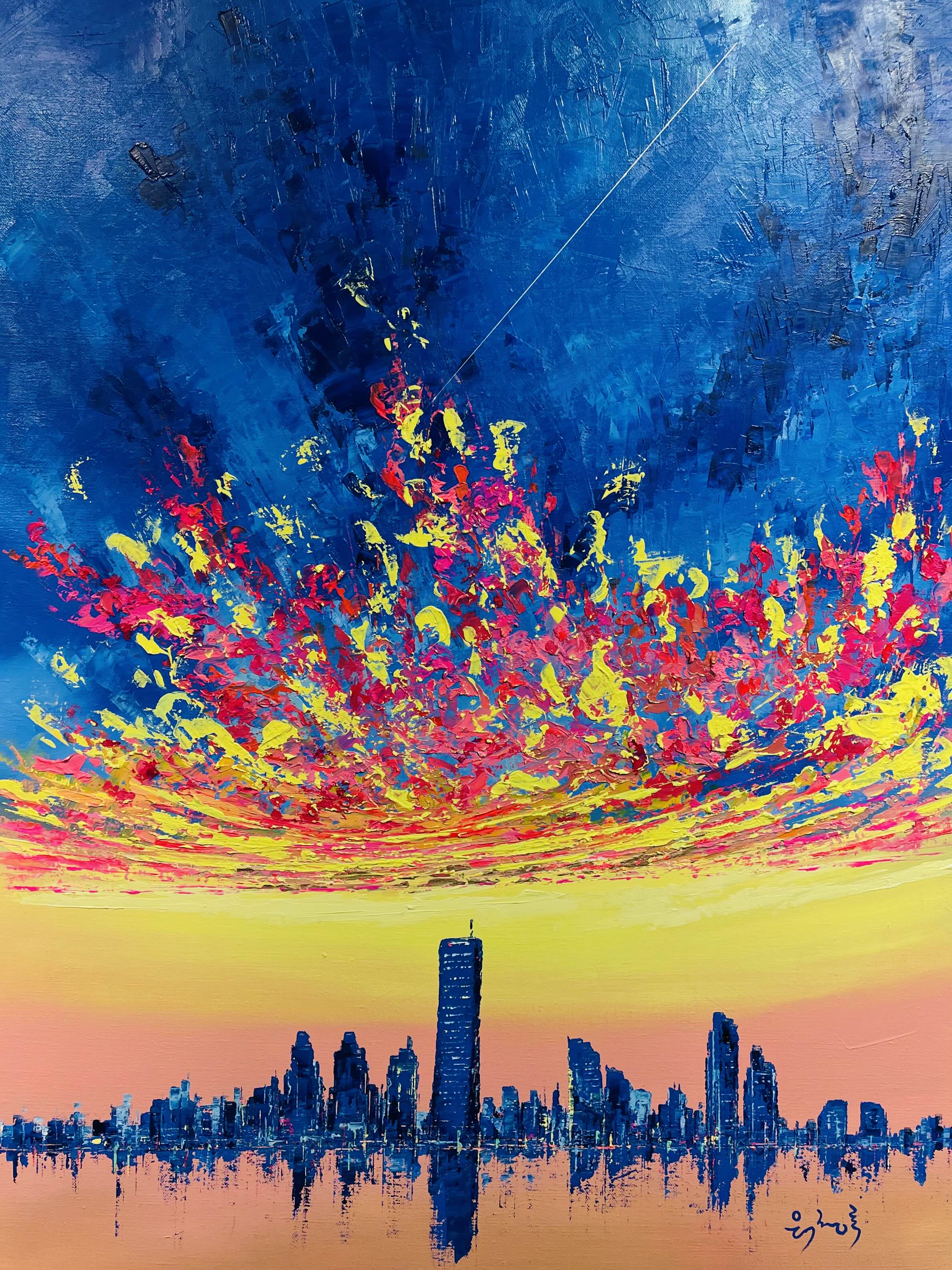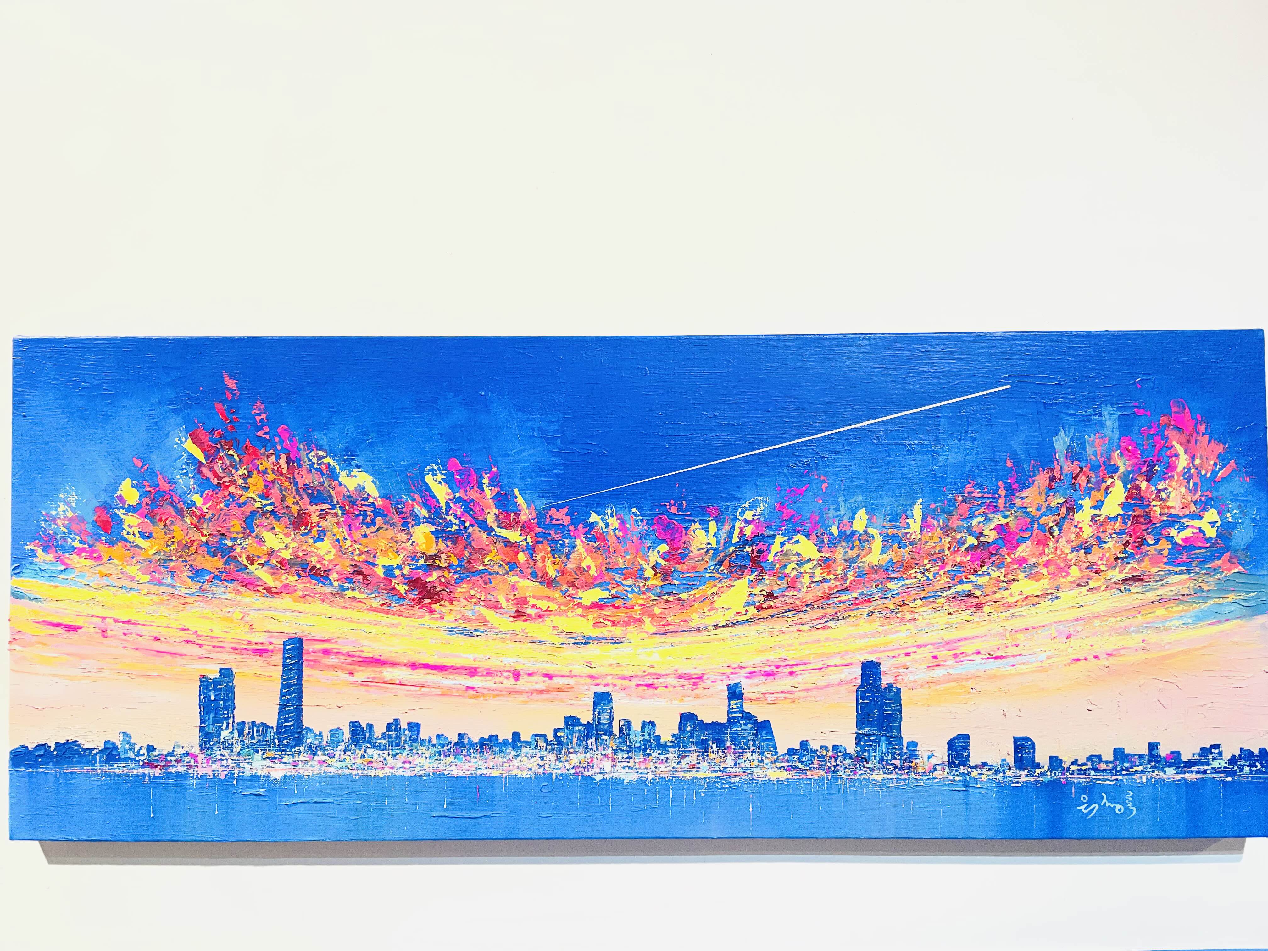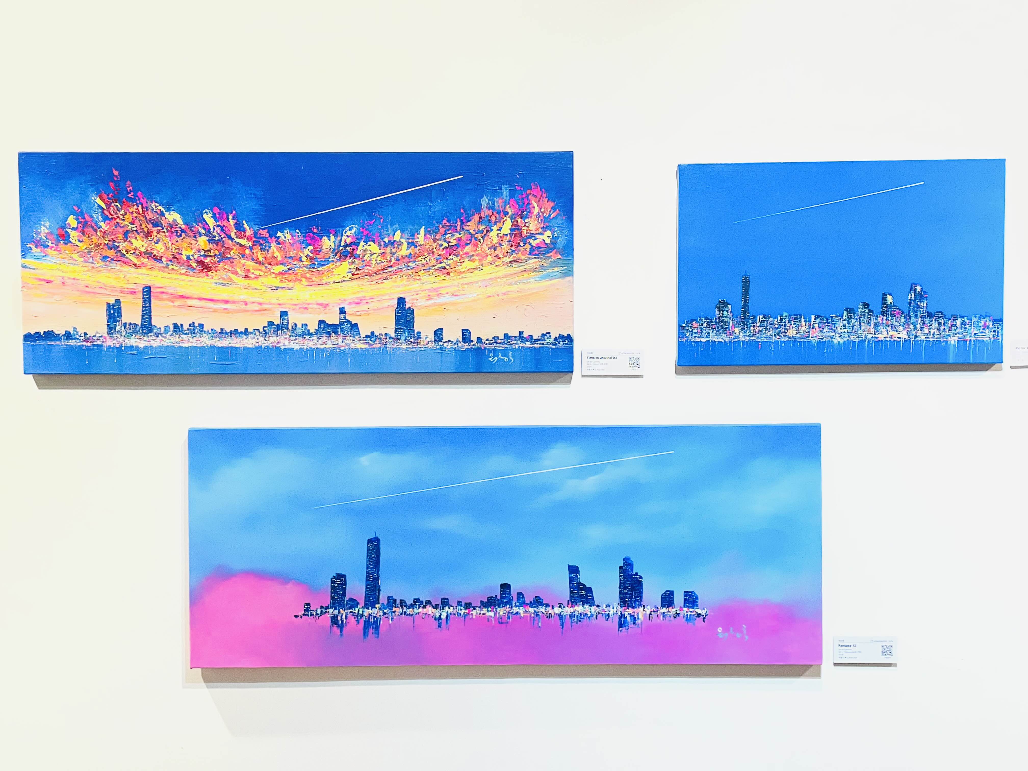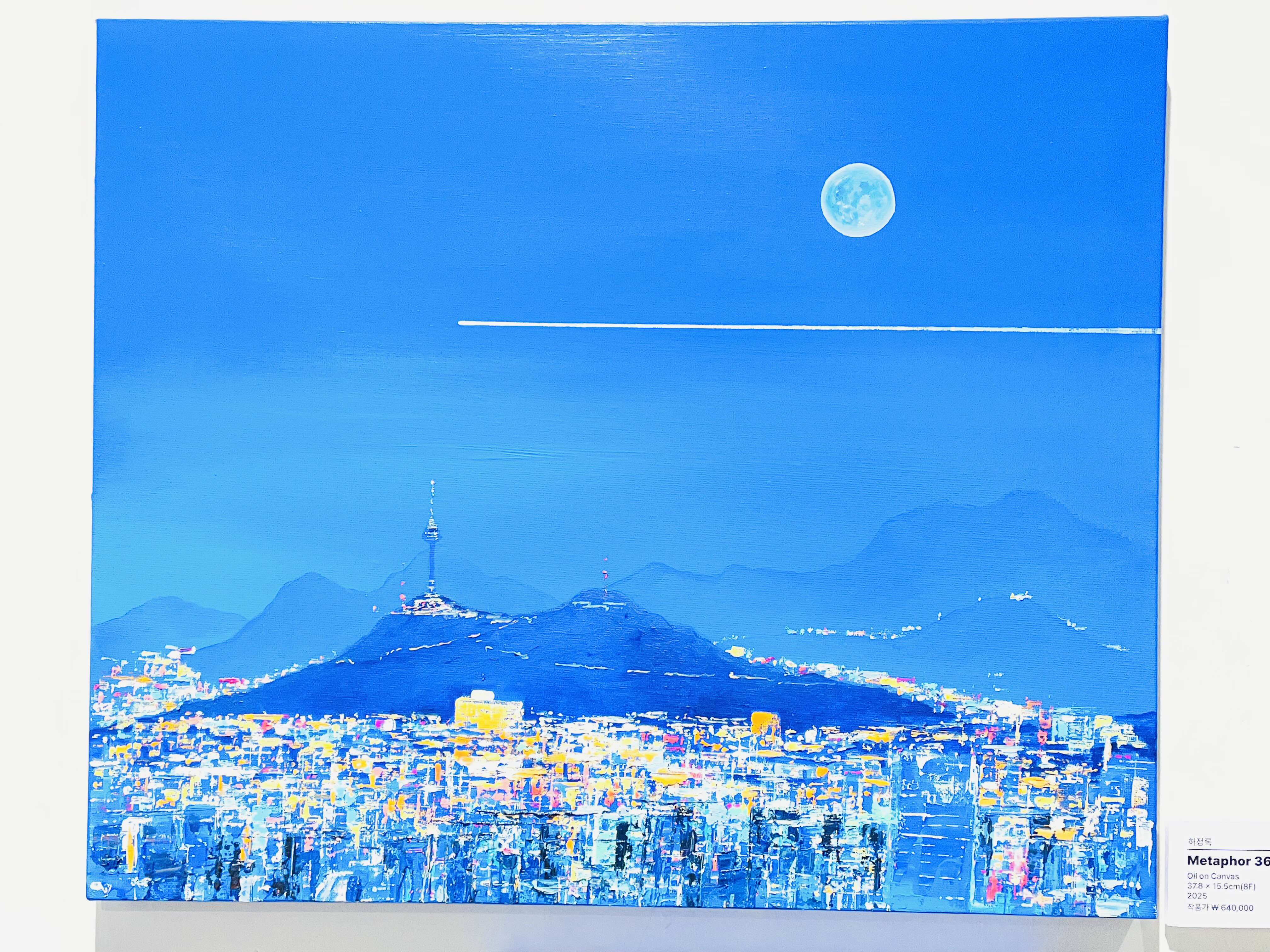 이번 전시 《Good evening, My love》는 작가가 지속적으로 탐구해온 저녁의 서사를 네 개의 연작-Sunset Euphoria〉, 〈Metaphor), 〈On my way Home〉, 〈Fantasy〉을 통해 펼쳐 보인다. 작가는 도시의 스카이라인 위로 번지는 노을, 빌딩 숲 사이로 모습을 드러내는 남산타워, 그리고 집으로 향하는 길목의 풍경을 강렬한 색채와 역동적인 붓질로 포착한다. 화면 위에서 분홍과 주황, 푸른 밤의 색조가 충돌하고 화해하는 방식은 낮과 밤, 노동과 휴식, 역할과 본연의 자아 사이를 오가는 현대인의 심리적 진동을 시각화한다.