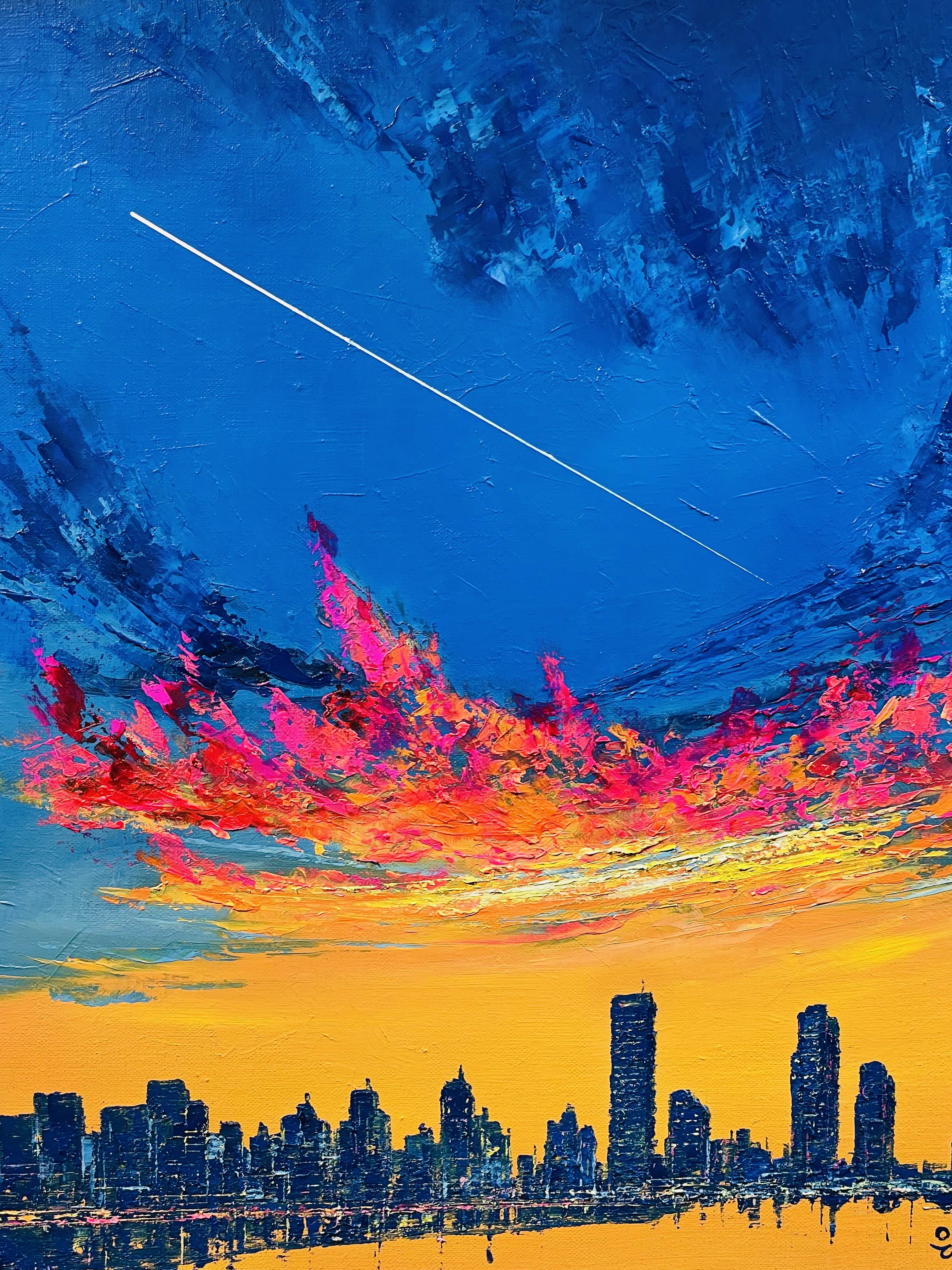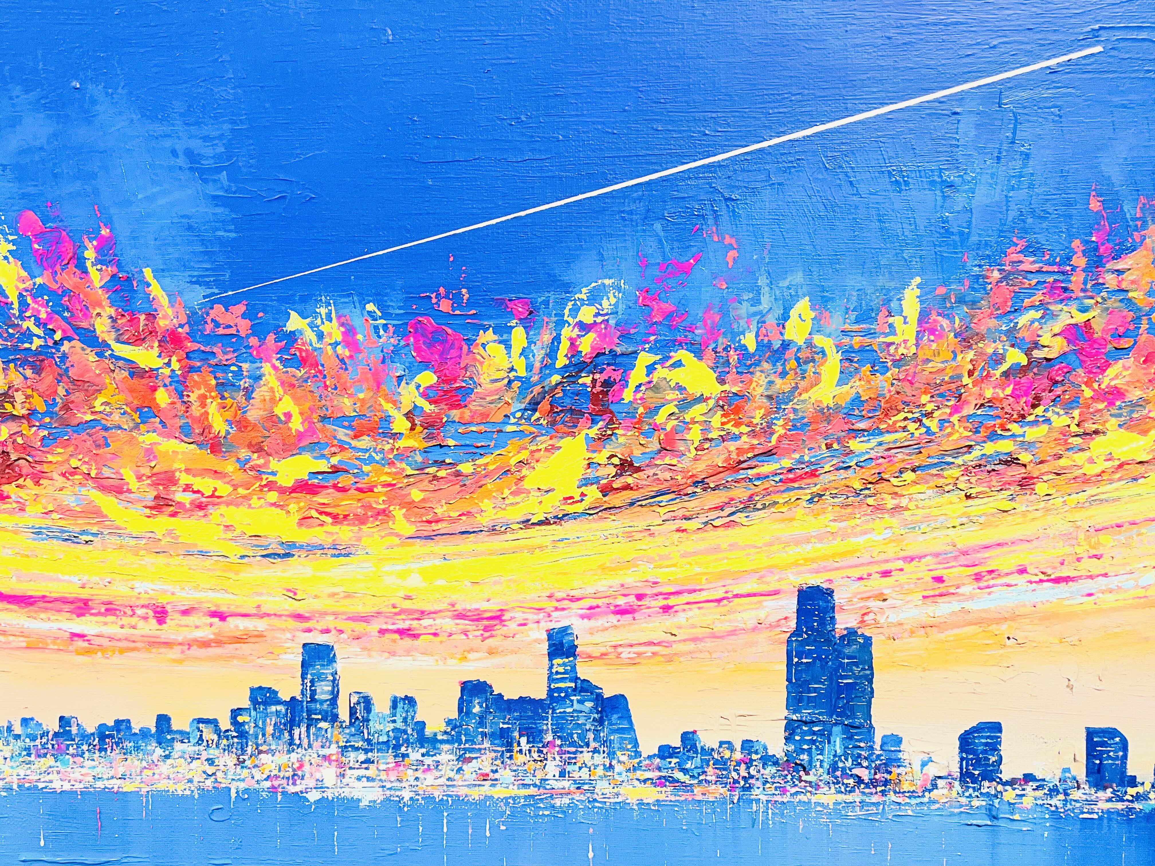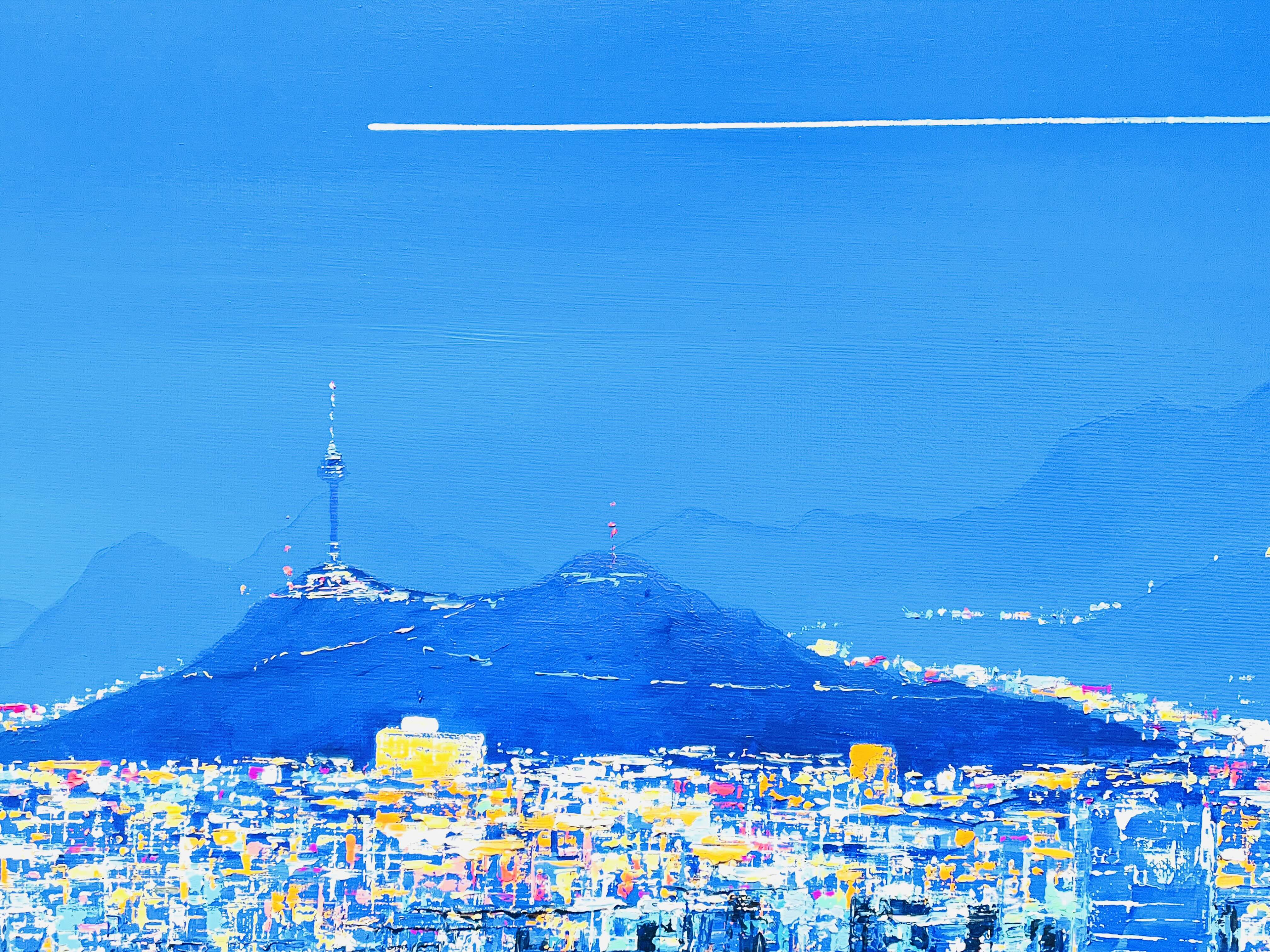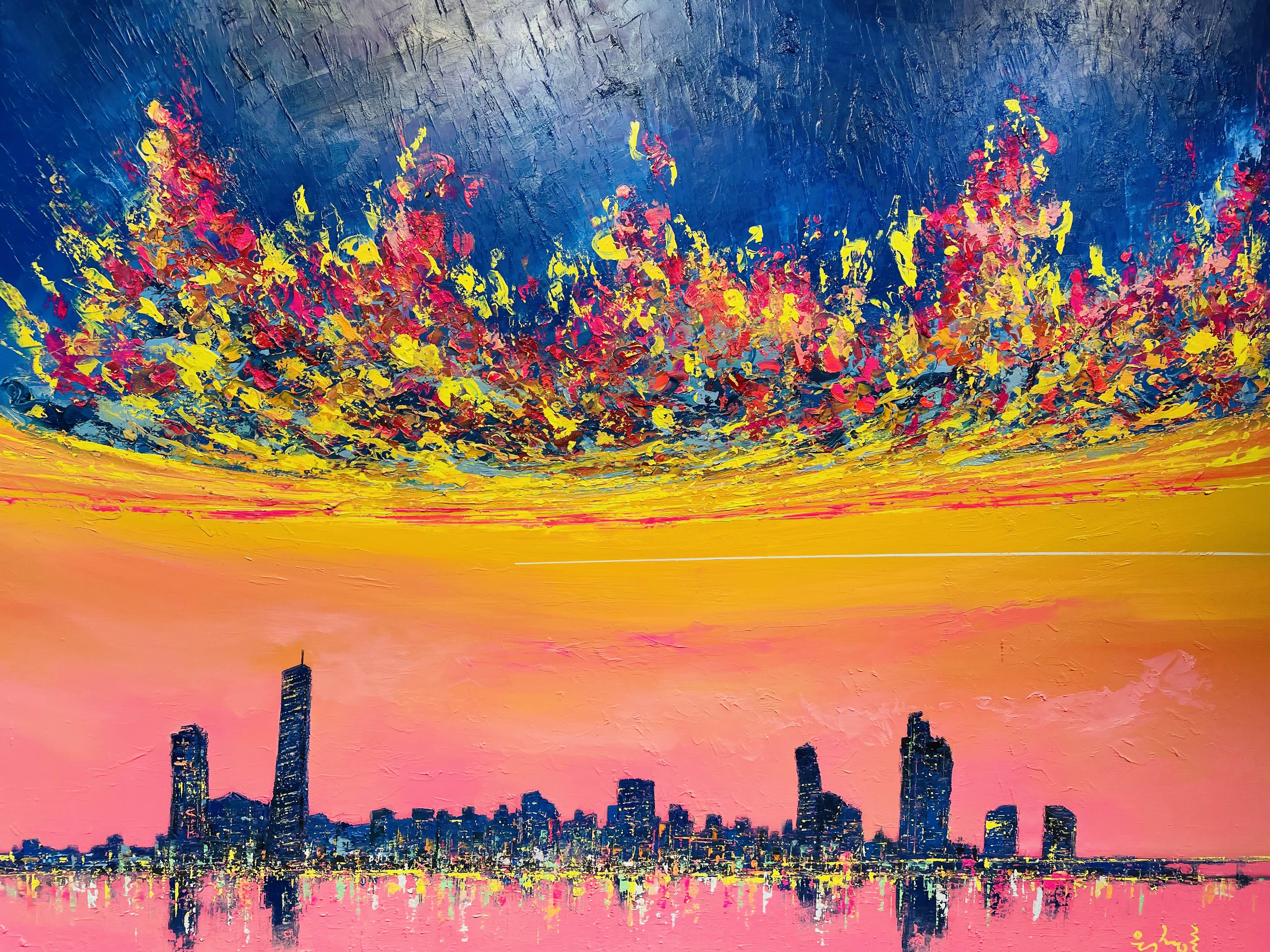 이번 전시 《Good evening, My love》는 작가가 지속적으로 탐구해온 저녁의 서사를 네 개의 연작-Sunset Euphoria〉, 〈Metaphor), 〈On my way Home〉, 〈Fantasy〉을 통해 펼쳐 보인다. 작가는 도시의 스카이라인 위로 번지는 노을, 빌딩 숲 사이로 모습을 드러내는 남산타워, 그리고 집으로 향하는 길목의 풍경을 강렬한 색채와 역동적인 붓질로 포착한다. 화면 위에서 분홍과 주황, 푸른 밤의 색조가 충돌하고 화해하는 방식은 낮과 밤, 노동과 휴식, 역할과 본연의 자아 사이를 오가는 현대인의 심리적 진동을 시각화한다.