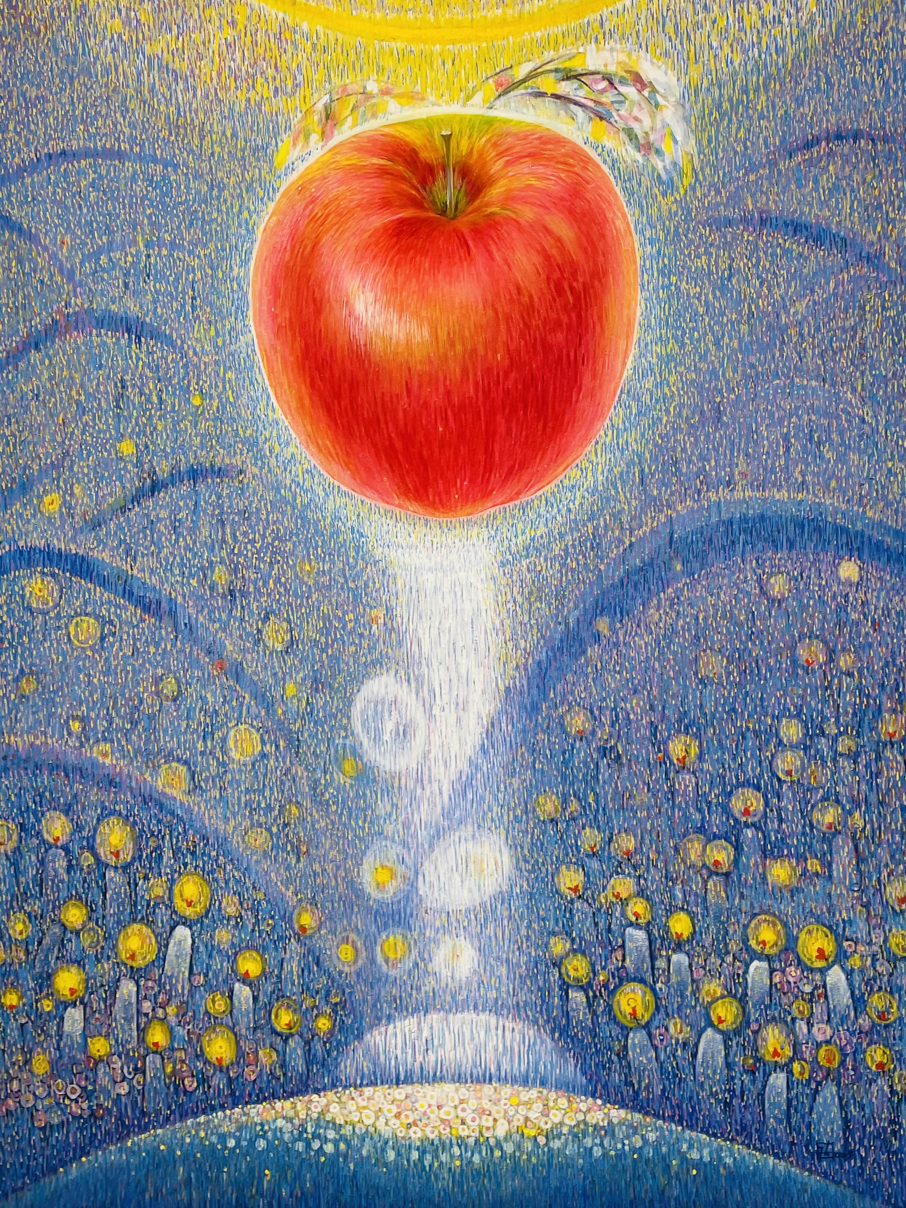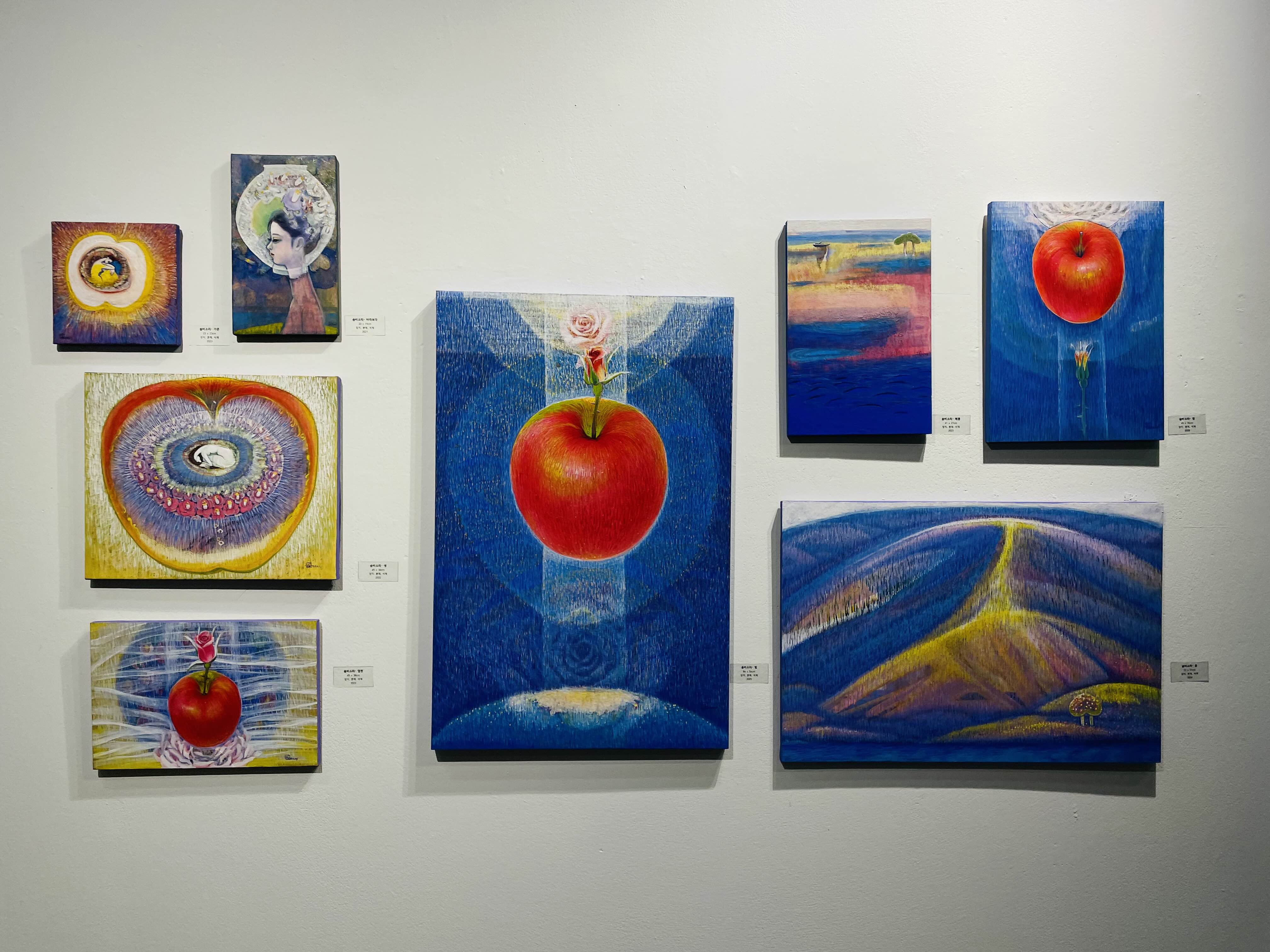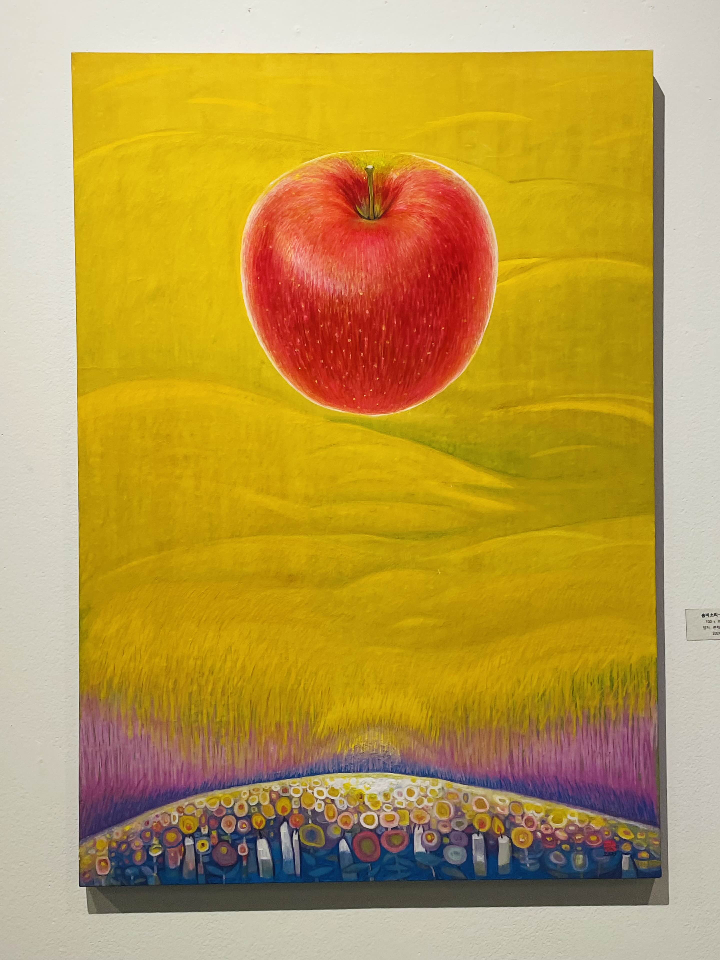오름의 곡선은 생명을 잉태하고 품어내는 본질적 개념으로 확대된다. 맥놀이와 같은 신비한 숨비소리의 울림은 목숨줄 같은 테이 붉은사과로 현현하며, 들숨과 날숨으로 허물어진 산허리는 닳고 닳아서 뭉툭한 곡선으로 깎여 나간다. 상처와 슬픔과 고통은 아름다움의 결정체가 되어 떠오르는 태양처럼 강렬한 생명을 품은 사과가 되어 희망의 터전인 또 하나의 오름이 된다.