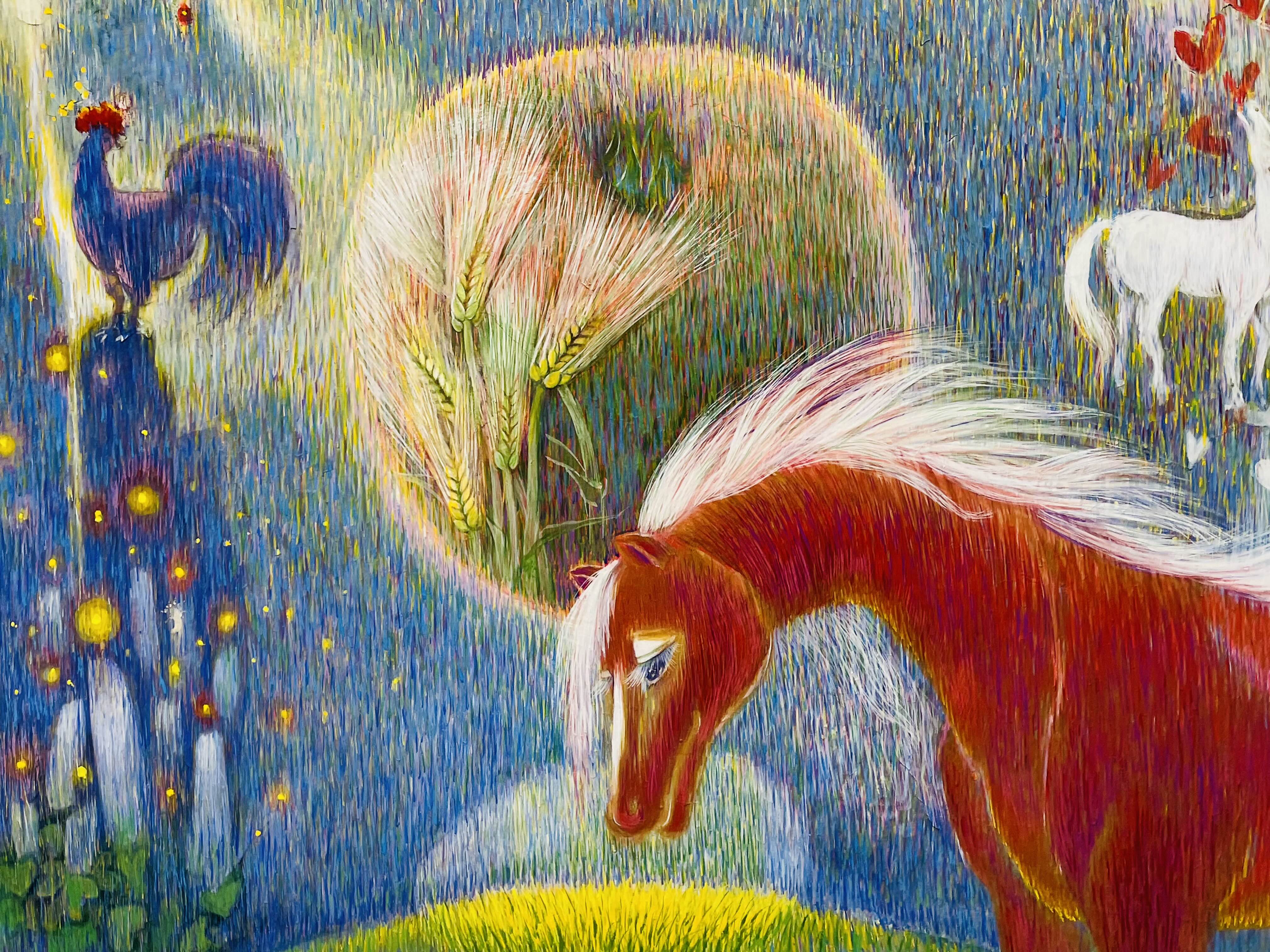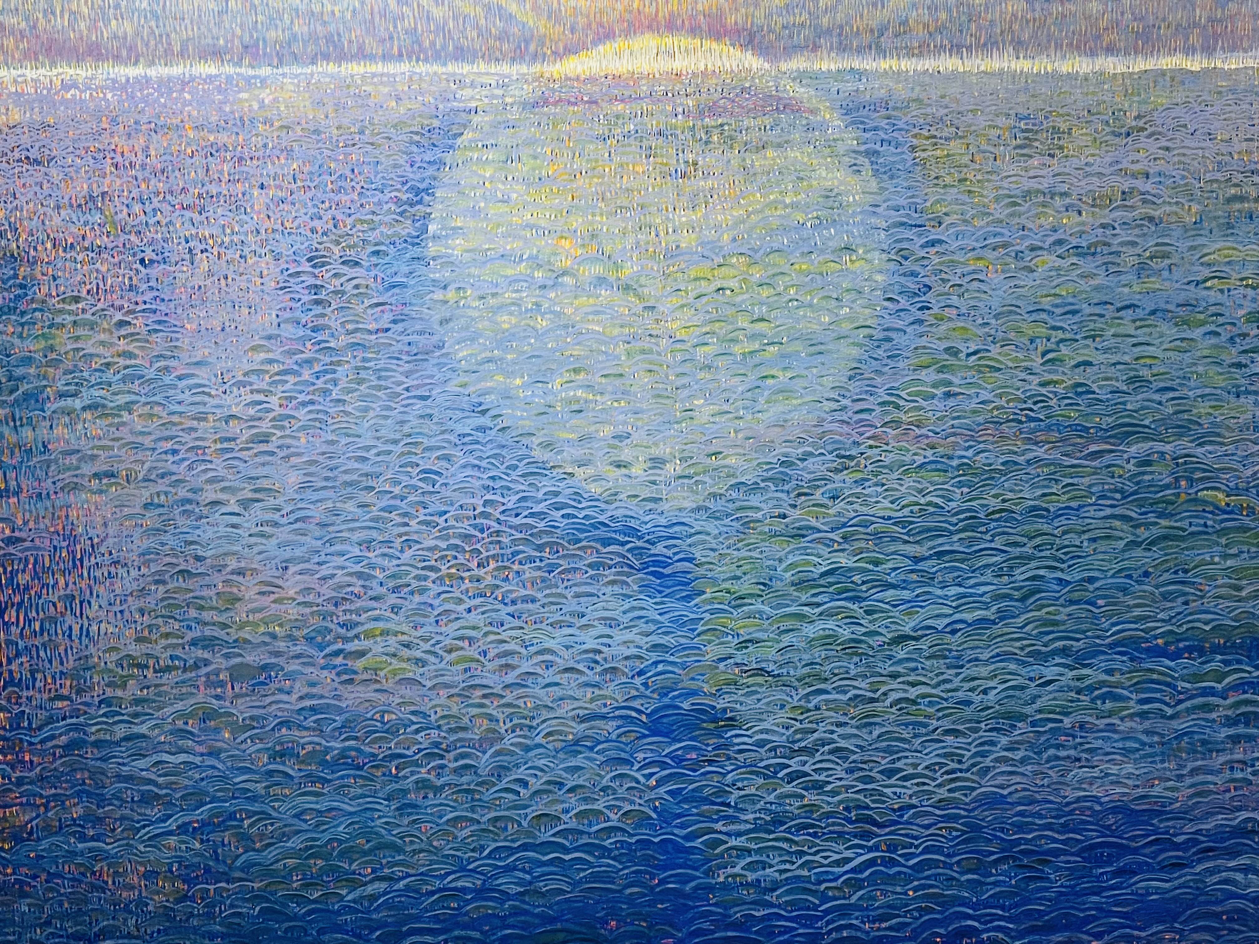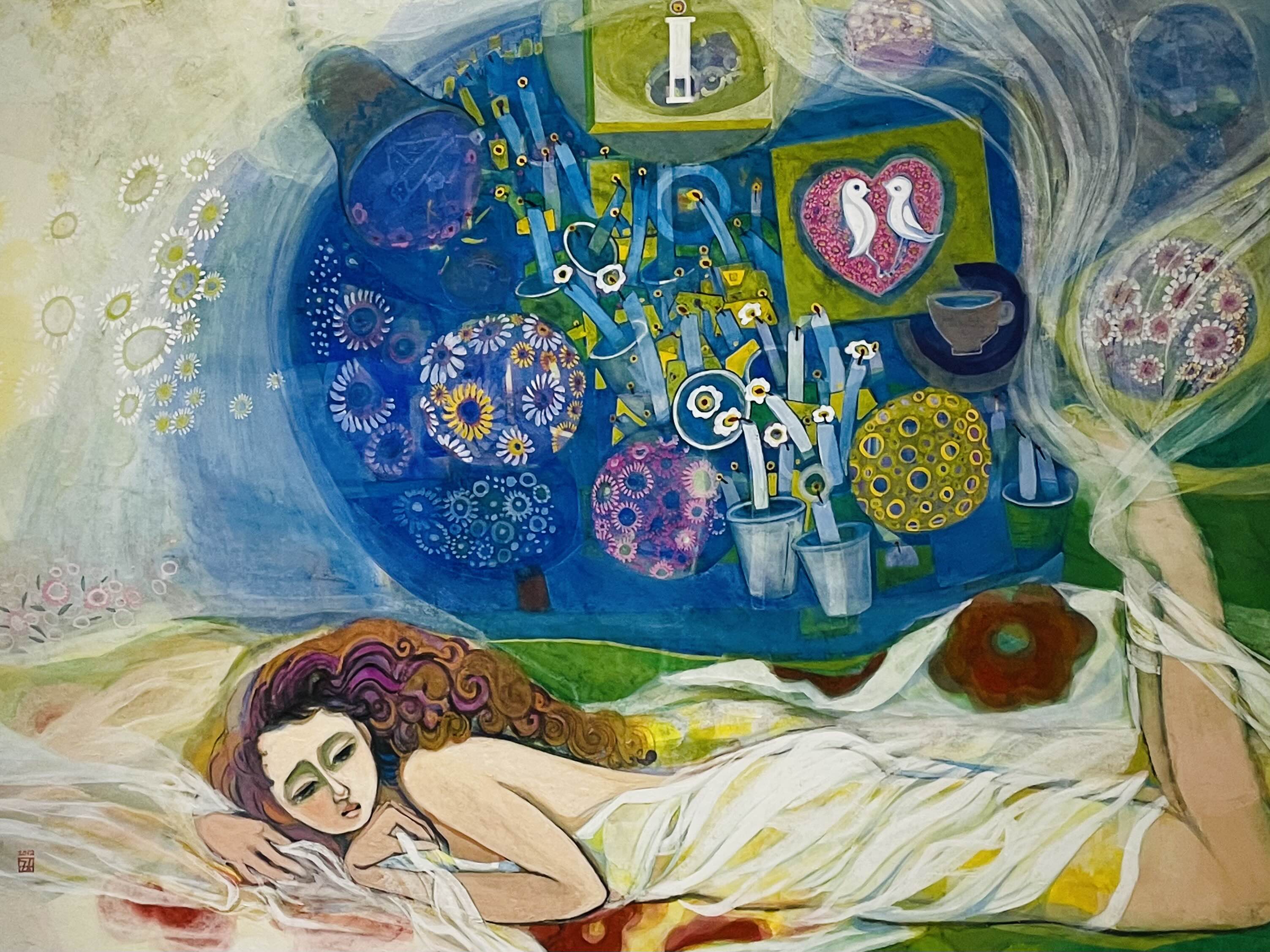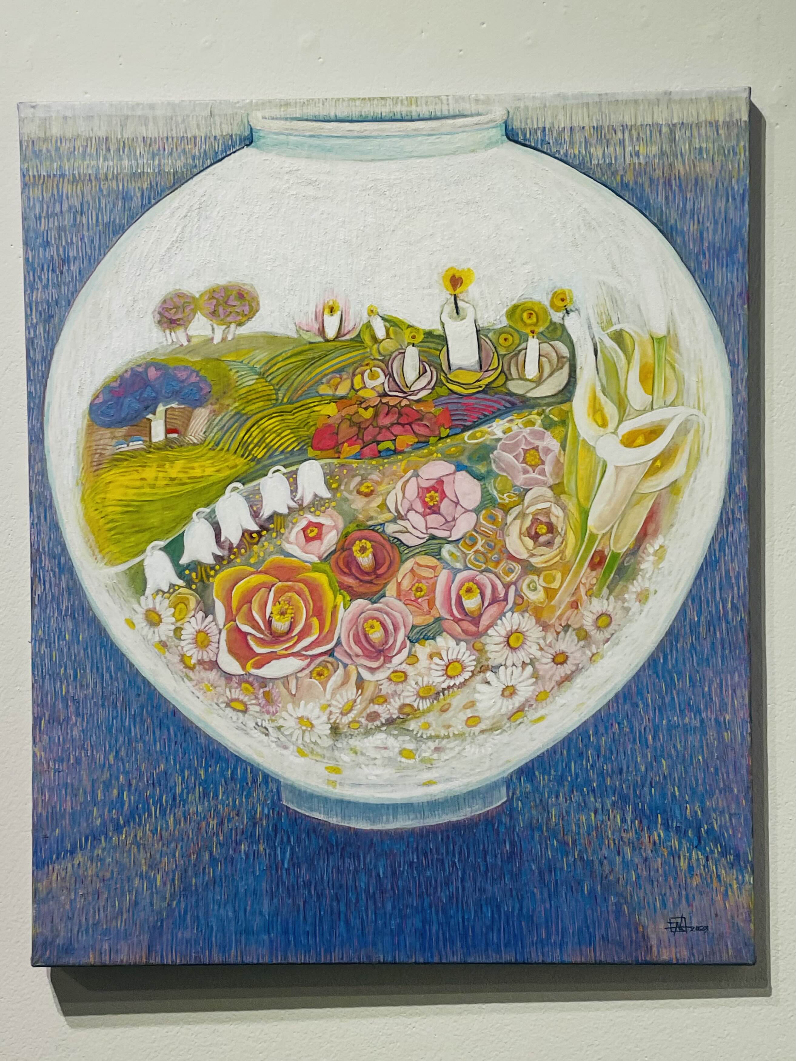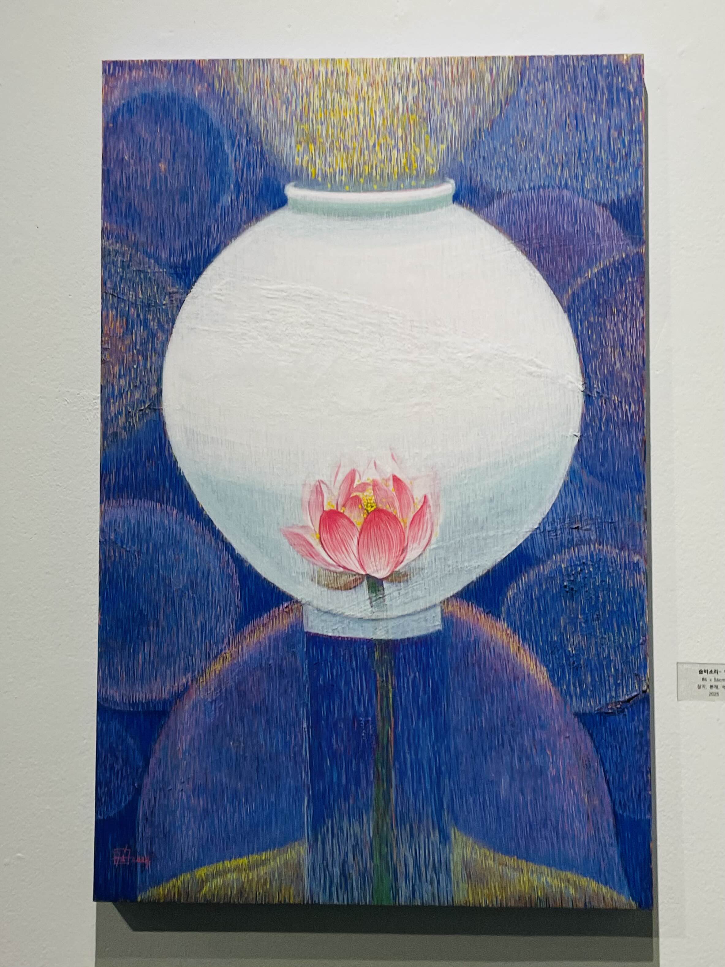 특히, 작품 주제인 숨비소리의 파동에너지를 한호흡 한호흡을 한국화의 붓질 하나 하나로 시간과 공간의 층위에 정성을 담아 채색을 물들이고 쌓아 나간다. 이러한 고단한 작업을 통하여 작품에 영혼을 불어 넣어 주는 맛과 멋을 풍기는 특별한 미감, 그 전통 채색화 발효색채의 미학을 발견하기를 고대한다.